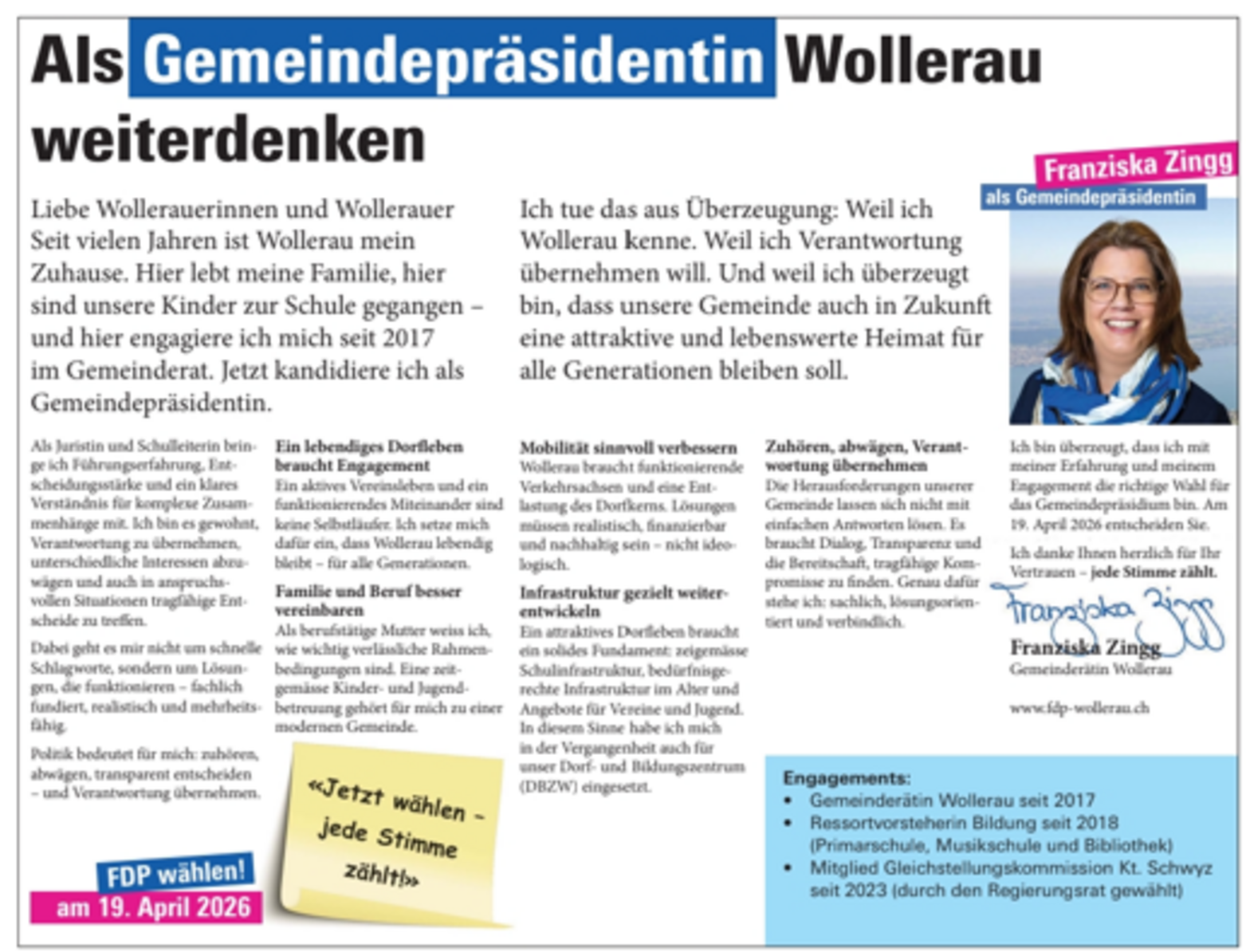 Am 19. April 2026 findet die Wahl für das Gemeindepräsidium statt. Nach neun Jahren als Gemeinderätin ist für mich der richtige Zeitpunkt gekommen, die Herausforderung als Gemeindepräsidentin anzunehmen. Die Mitgliederversammlung der FDP hat mich bereits einstimmig als Kandidatin nominiert.