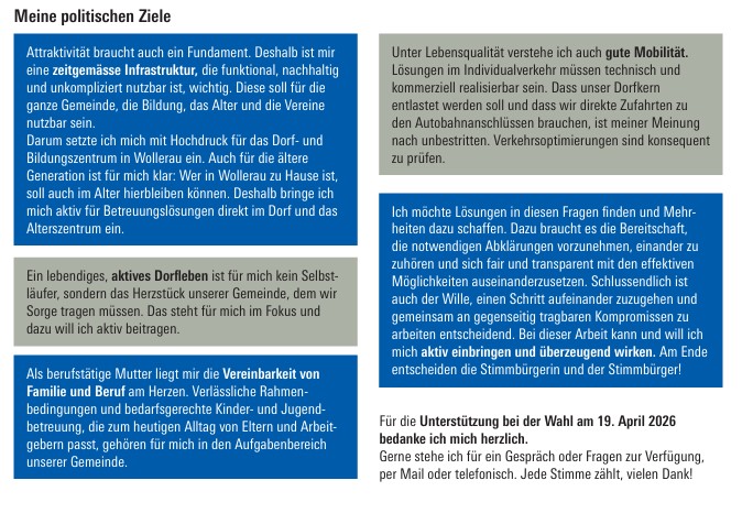 Ich stelle mich zur Wiederwahl, weil ich mich für Wollerau engagiere und sachpolitisch pragmatische Lösungen für die Herausforderungen meiner Gemeinde suche.